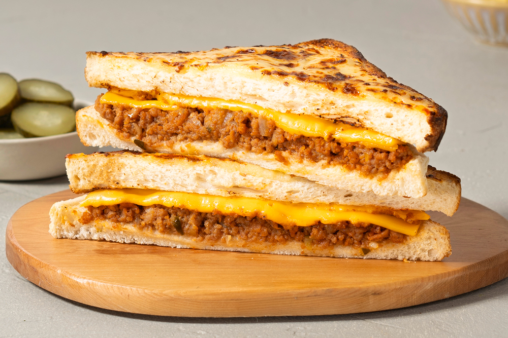 Seasoned juicy ground beef with cheese, mustard and pickle on soft white bread, topped with a unique extra cheesy sauce.