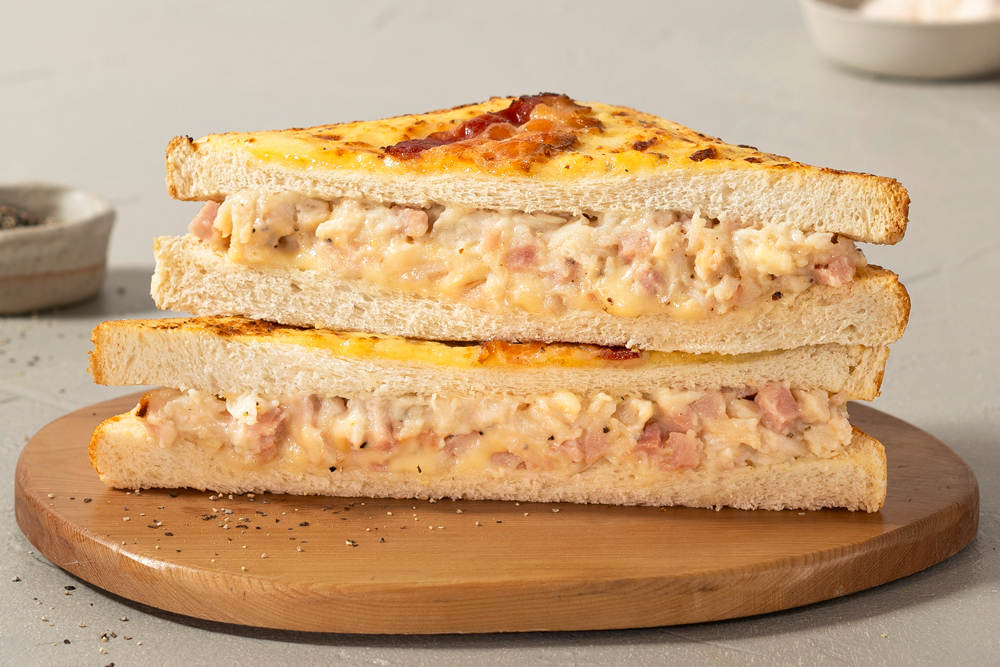 White bread filled with perfectly seasoned chicken and bacon pieces with a grilled cheese and unique extra cheesy sauce topping