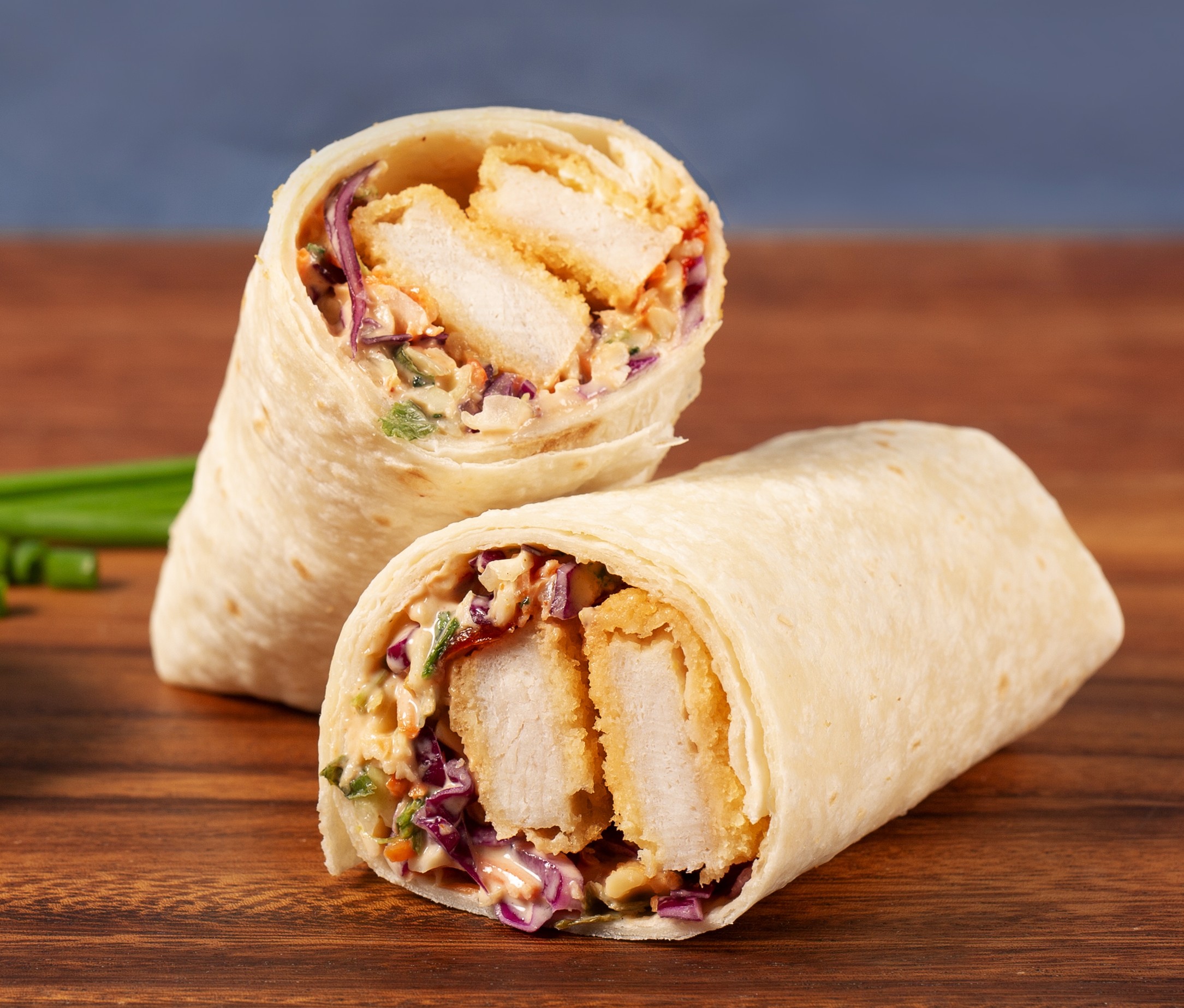 Crumbed chicken tender with creamy peri peri slaw wrapped in a soft tortilla wrap