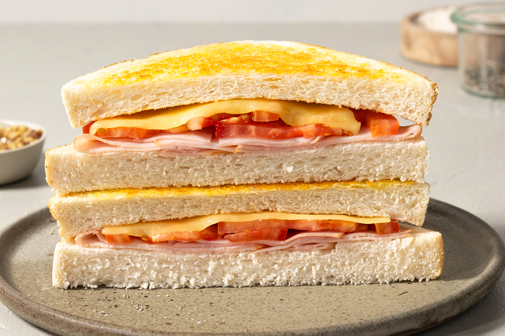 Traditional premium ham, tasty cheese and tomato on thick white bread