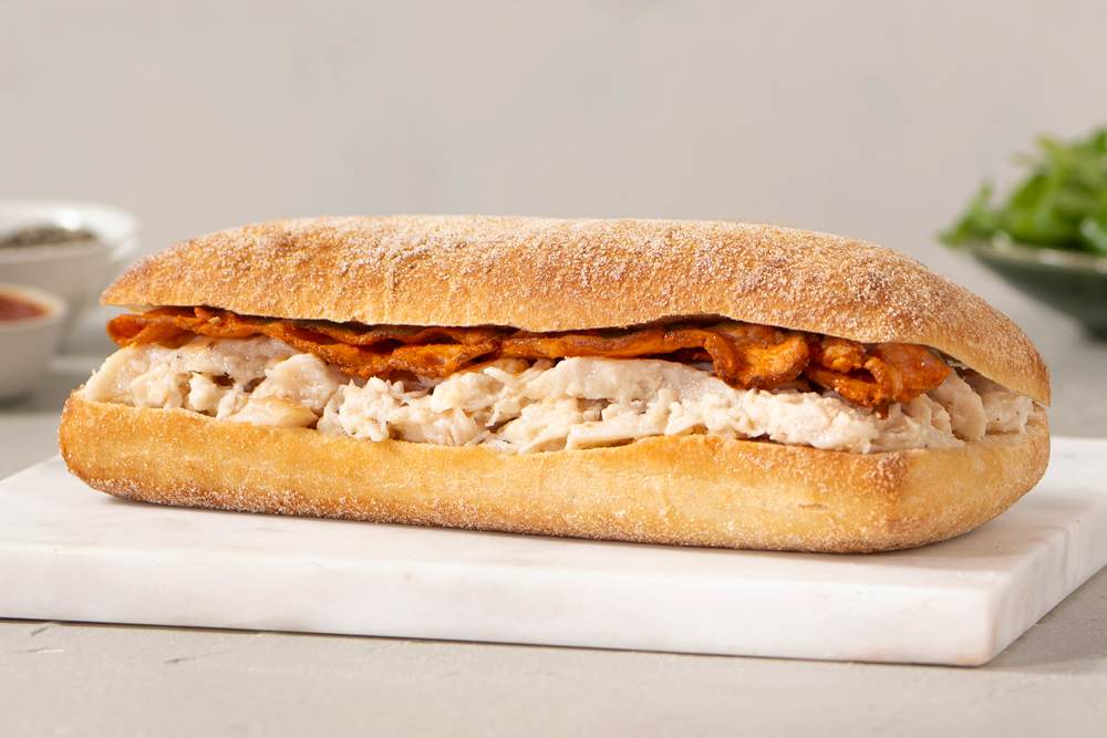 Tender roasted chicken pieces paired with streaky bacon strips marinated in Sriracha sauce on ciabatta